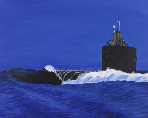 Depicts a U.S. first flight 688 class at high speed on the surface.